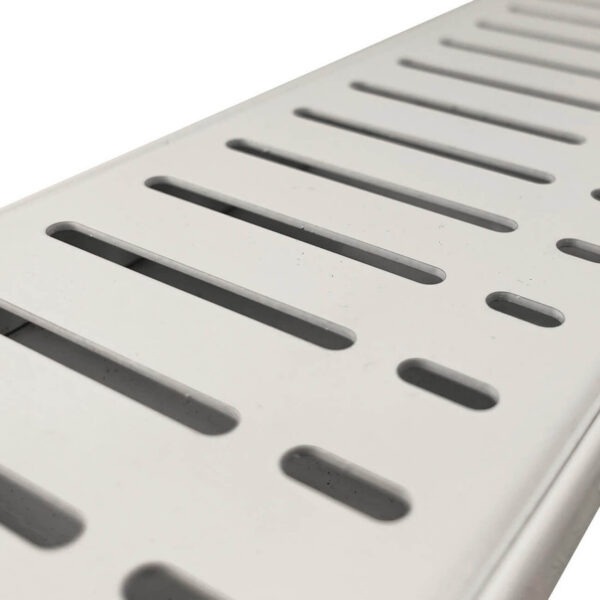 Our flow pattern white drainage breaks down the straight lines and adds a soothing, flowing look to your project. The straight lines intercepted by a flowing break are gentle on the eye whilst maintaining a strong architectural appearance. Minimal style is the look everyone is chasing in bathroom design and the flow pattern grate doesn’t disappoint.